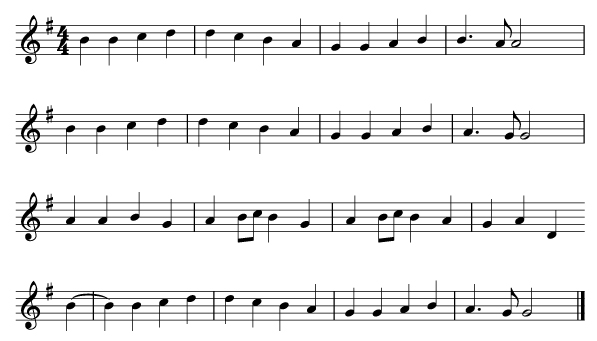 - 一般來說,主題的構成可以是一個二樂句或四樂句的對稱樂段,長度是八、十六或三十二小節,見貝多芬《第九交響曲》「合唱」第四樂章,合唱部分開始時的《歡樂頌》,主題共長十六小節。